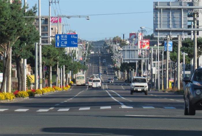 末広町の南岸通り、西4号線バス停前から野付牛自動車学校方向