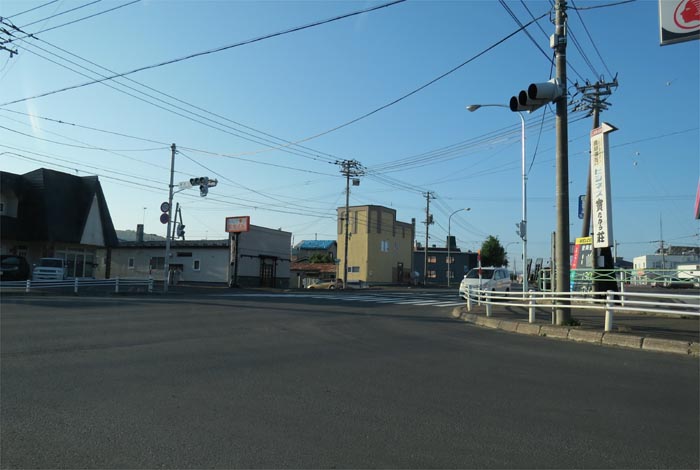 南岸通り、野付牛自動車学校前、奥がとん田通りの交差点