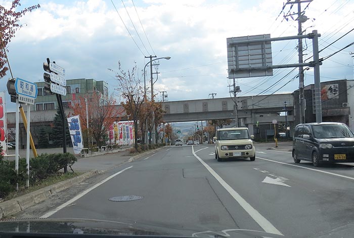 前方がJR石北本線高架橋、写真右が北見駅方向