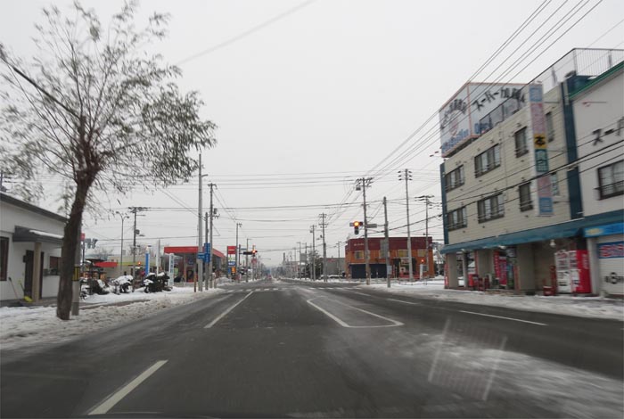 南岸通り、野付牛自動車学校前、奥がとん田通りの交差点