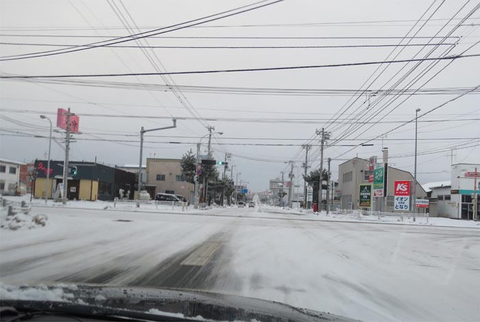 南岸通り、野付牛自動車学校前、奥がとん田通りの交差点