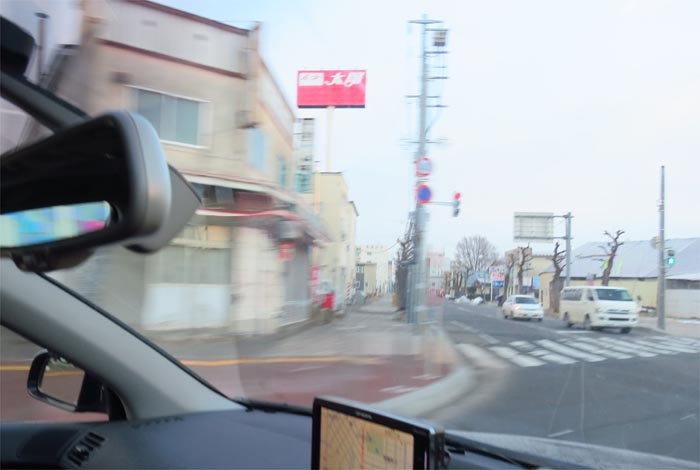 南岸通り、野付牛自動車学校前、奥がとん田通りの交差点