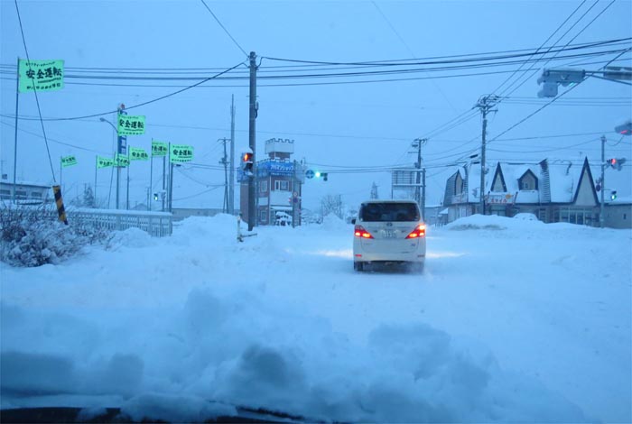 南岸通り、野付牛自動車学校前、奥がとん田通りの交差点