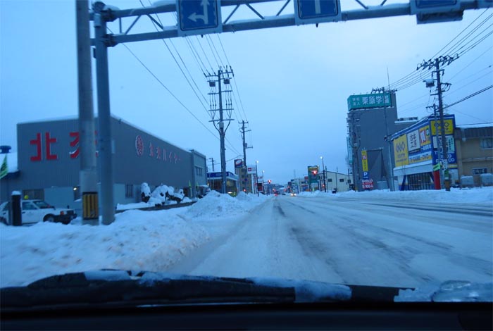 南岸通り、野付牛自動車学校前、奥がとん田通りの交差点