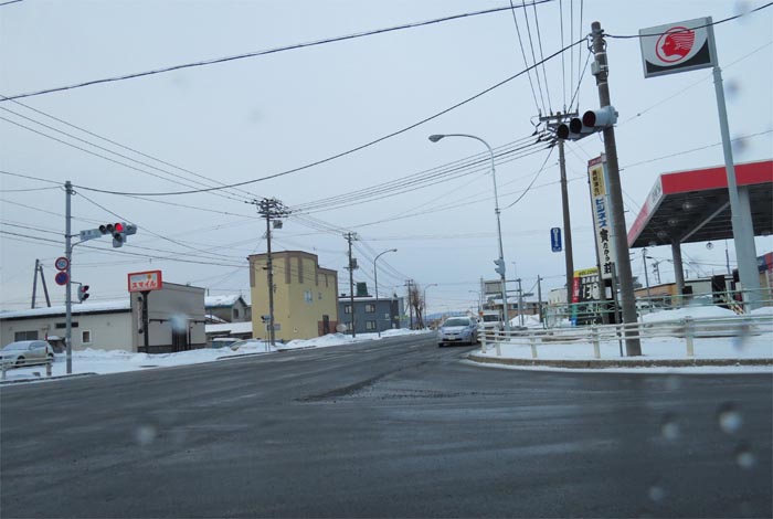 南岸通り、野付牛自動車学校前、奥がとん田通りの交差点