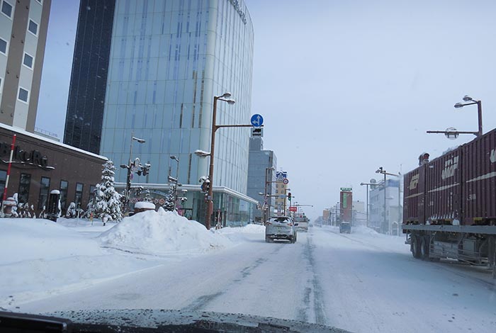 国道39号、北見神社の鳥居前から東9丁目歩道橋方向
