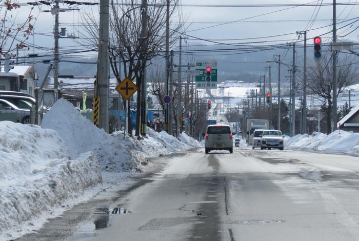 前方がJR石北本線高架橋、写真右が北見駅方向