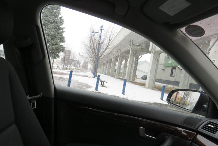 前方がJR石北本線高架橋、写真右が北見駅方向