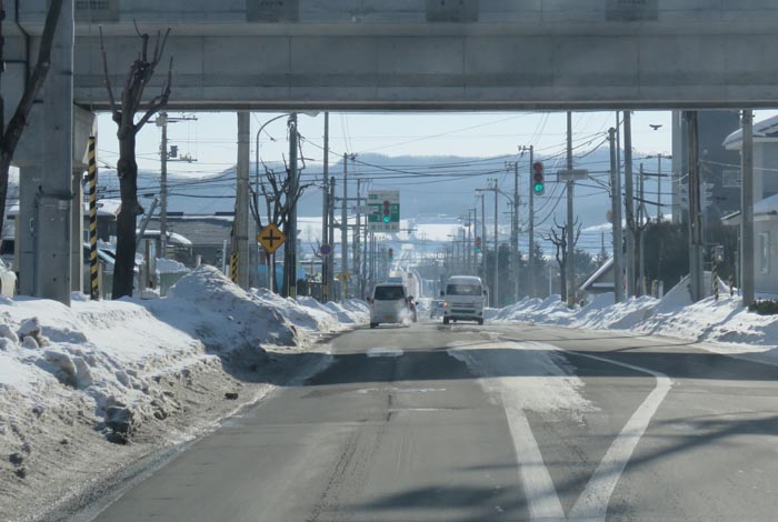 前方がJR石北本線高架橋、写真右が北見駅方向