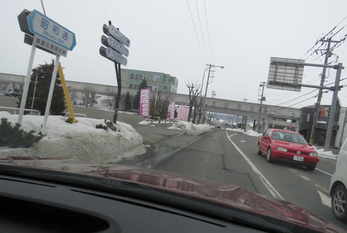 前方がJR石北本線高架橋、写真右が北見駅方向