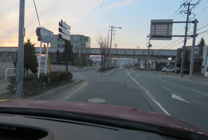 前方がJR石北本線高架橋、写真右が北見駅方向