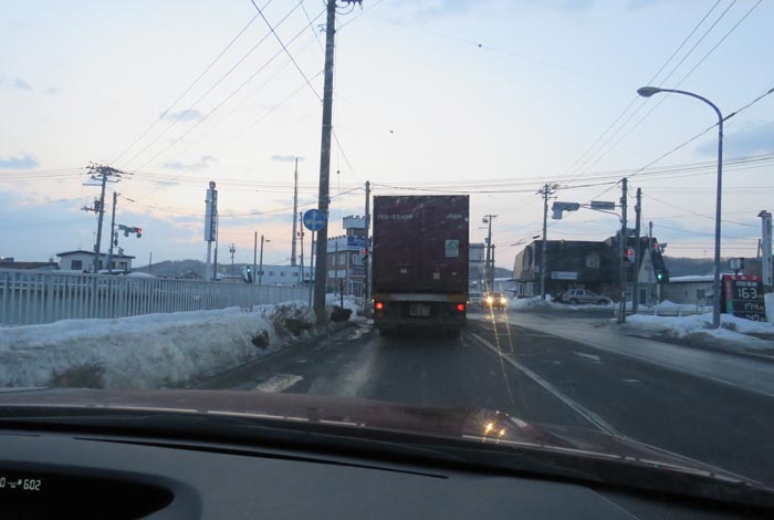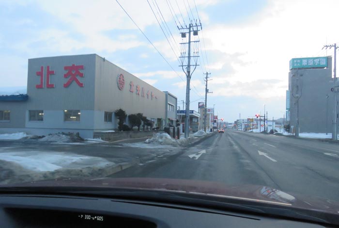 南岸通り、野付牛自動車学校前、前方はとん田通りの交差点
