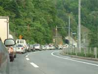 トンネル工事現場のサロマ側。信号待ちの車列。