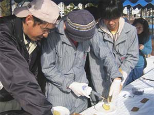 | 10月23日の土曜日、常呂町多目的研修センターの百年広場を会場に、毎年恒例となっている「JA常呂主催」の「農畜産物即売会」が開催されました。 当日は、朝から強い風と雨のためJA常呂の関係者やイベント・スタッフのみなさんは、冷や汗?をかきながら会場準備を進めました。イベントが始まる正午ころには、天候も回復してホッしたのもつかの間、多くの町民のみなさんが押し寄せ?、わずか1時間ほどで、ほぼ売り尽くされたようでした。 うどんの試食、わんこうどんの早食い大会、「揚げポテトドッグ」の無料配布、新鮮で安全な産地自慢!のじゃがいもやたまねぎ、手作りジャムの販売など、毎年この日が来るのを待っている方たちには、たまらないイベントです。 |