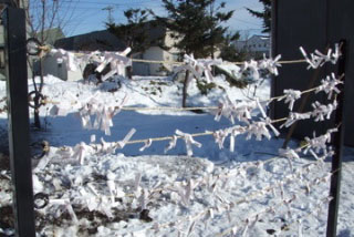 おみくじが結んであります。確か悪い運勢のくじをこうするんでしたよね。持ってくればよかったよ。
