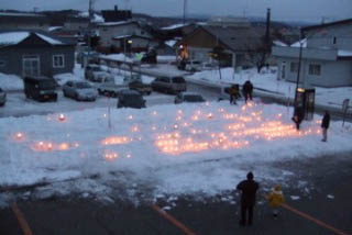 | これです。 毎年紹介しております、「双子の桜ハートキャンドル」です。バレンタインデーに、共和の「双子の桜の丘」の下に灯される炎。百個のアイスキャンドルによって、形作られます。双子の桜ファンクラブによる作です。クラブの会長は、さきほどの名人です。 |