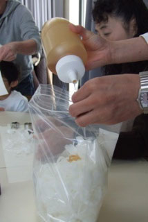 | かつお節のようになった石けんを袋に入れ、はちみつ大さじ一杯と…… |