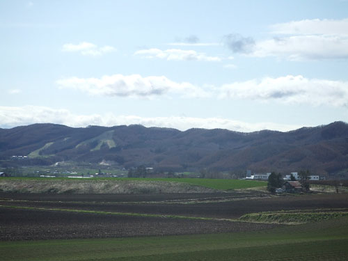 | スキー場から左に90度ほど視点を変えると、そこには雌阿寒岳の姿が。 やや左側の、かすんでいる山がそれです。 阿寒の山々は、美幌町からはよく見かけますが、ここ端野町からも見えるなんて、新鮮な驚きです。 やっぱり大きい山なんだなあ、とあらためて実感しました。 |