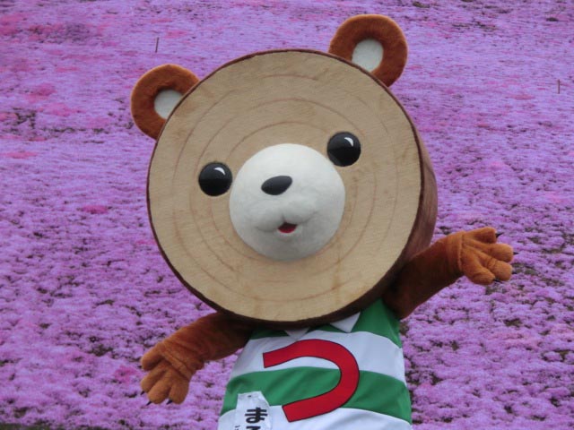 大空町・東藻琴芝桜公園のピンクを背景にした「まる太くん」