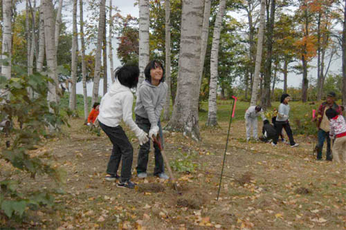 サロマ湖畔の遊園地Family愛LandYOU隣接の「いこいの森」でしらかばの植樹と木や枝を使ったフリーウッディーの森林体験学習をしました。丸太の輪切りに悪戦苦闘・・・木の年輪や樹皮の模様、木肌の色などをうまく使いいろんな作品が出来上がりました。