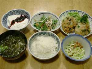 | ・ご飯 ・お吸い物(おぼろ昆布) ・長いものコロッケ ・春菊のサラダ ・納豆 ・ヨーグルト(ブルーベリージャム添え、自家製!) |
