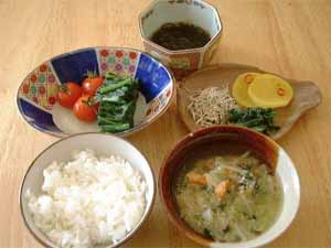 | ・ご飯 ・味噌汁(ニンジン、キャベツ、アーサー) ・ほうれん草のおひたし、ミニトマト ・ジャコ、沢庵、高菜の醤油漬け |