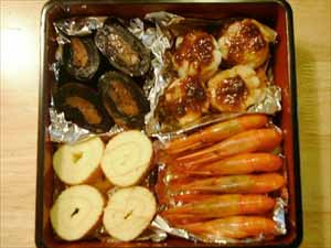 | 黒豆となますの他は全部今日一日で作りました。今年は手抜きもいいところですが、結構一日でもできるものです。黒豆は丹波の豆が手に入り、いつもになく上出来となりました。錆釘も入れて、色良く仕上がりました。なますも何日も漬けたのでいい味です。栗きんとんは金時芋をちゃんとくちなしの実で色をつけたので、これまた上等です。昆布巻だけは今年は既製品となりました。かまぼこも食紅で色をつけ、薄いピンクで上品に仕上げます。恒例の岩石卵がないのがちょっと淋しいですが、お正月になってからゆっくり作ろうと思います。おせち料理が仕上がったので、これで一安心です。 |
