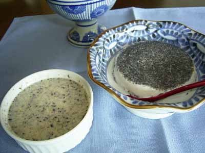 (3) 氷水にあてながらあら熱をとり、完全に冷めたら、生クリームを入れる。 少しとろみがつくまで混ぜ、黒すりごまを加える。 |