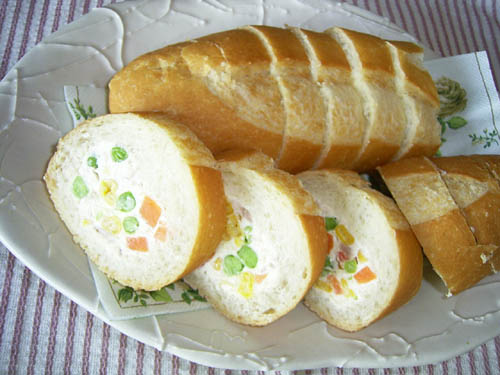 | ●材料 フランスパン(日糧のが固過ぎず良いです)・・・・・1本 クリームチーズ・・・・・・・・・・・・・・・・250g ミックスベジタブル・・・・・・・・・・・・・・250g ツナ缶・・・・・・・・・・・・・・・・・・・・・・1個 マヨネーズ・・・・・・・・・・・・・・・・・・・・適量 |